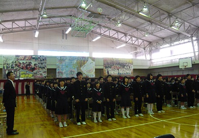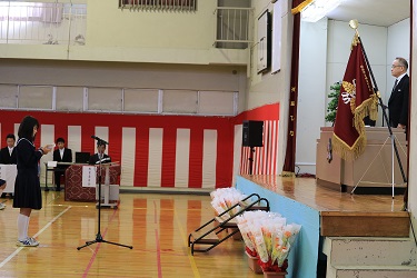 「平成26年度4月、3校の統合中学校に1年生として初めての入学生でした。新しい学校にすばらしい歴史を刻でくれました。これからみなさんは、義務教育が終わり、それぞれが自分で選んだ新しい環境へと旅だっていくことになります。不安もあると思いますが、みなさんなら大丈夫と確信しています。希望、情熱、優しさを持ち、自分以外の人としっかりと関わっていってください。人の優しさを素直に感じ取れる豊かな感情、辛いときでもくじけない強い意志、それを支える希望と情熱。それらをいつも大切にして生きていってください。」