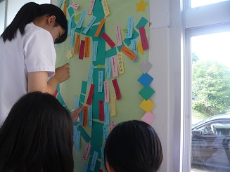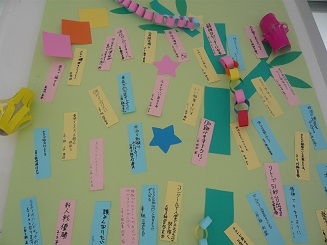 文化委員会では、七夕の短冊飾りを作りました。そこに全校生徒の皆さんにメッセージを書いてもらい、掲示しました。