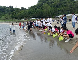 文化部の生徒は袖が浜で「2016クリーンアップ能登」に参加して、海辺をきれいにしました。その後ヒラメの稚魚の放流をしました。ヒラメがきれいになった海で大きく育ってくれることを願って海に放しました、大きくなったらおいしく食べたいです。