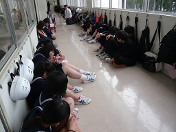 輪島中学校では、無言清掃をしています。しゃべらずに時間いっぱい掃除をします。心を磨きながら校舎を磨きます。10分間の掃除の前に座って黙想をして心を落ち着けます。