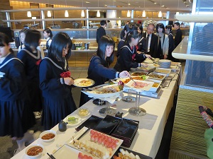 夕食はバイキングです。栄養バランス良く、食事マナーを守って、おいしく食べました。お腹いっぱいです。