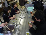 1年生は総合的な学習の時間に地域の伝統文化について調べました。夏祭り、三夜踊り、輪島塗りなどを調べました。また食文化についても調べました。輪島では、いしるという全国的にもめずらしい食べ物があります。いしるは魚介類に20%程の塩をまぶして、樽で3年ほど漬け込みます。魚の自己消化、好気性細菌の働きで発酵させたものです。どろどろに溶けた魚の上澄み液を漉したものです。弥生時代から伝わるとても古い調味料です。大豆からつくる味噌は室町時代にできました。その後大豆の醤油もできて、魚醤油は作られなくなりました。でも、輪島などの奥能登地方では、今でも作られています。その魚醤にはたくさんの旨み成分と血圧を下げる成分が含まれていることが、榎本先生方の研究でわかったそうです。
