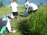 畑の草刈りとは違い、畦の草刈りは根を残して刈るそうです。草の根で畦が崩れないようにガードするそうです。刈りながら後ろに進むと良いそうです。教えてもらったように鎌を使って草を刈りました。難しかったのですが、上手と褒められる子もいました。