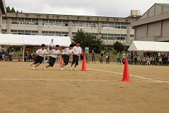 台風と雨のため1日延期した体育祭が10日行われました。時折小雨が降りましたが、全員で協力して、笑顔で楽しい充実した体育祭になりました。係が当たっていた委員会の生徒たちが朝早くに登校して準備をしてくれました。生徒会執行部による運営もスムーズに行われました。