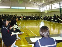 このスローガンはたくさんの応募の中から良い作品を選んで、その作品を組み合わせたものです。このスローガンにした理由は、輪島中学校の歴史はまだ浅いので一歩ずつ確実に、みんなの力を合わせて輪島中学校の歴史を刻んでいきたいと考えたからです。一年間、このスローガンをかかげて輪島中学校がよりよい学校になるように一緒に頑張りましょう。