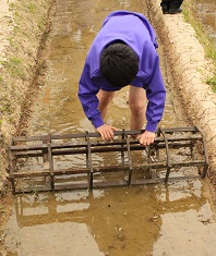 枠を転がして、間隔を決めて、稲の苗を植えました。