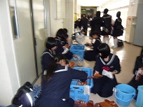16日の卒業式の予行練習をしました。午後は式の準備をしました。3年生の思い出に残る式になるように、心を込めて飾りつけをしました。