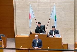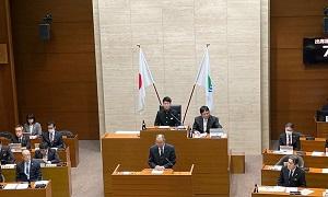 <議長席の德野さん 質問に立つ前田さん>