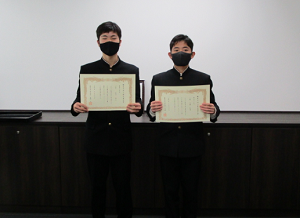 部員2人に優秀賞が届き、校長室で伝達式を行いました。