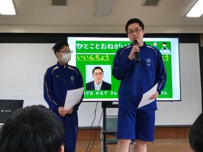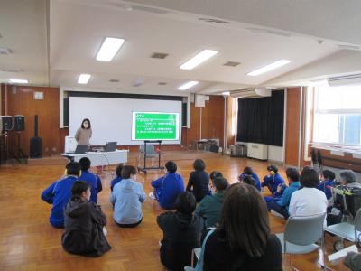 4月28日(金)授業参観があり、4限目に全校集会が開かれました。全校集会では、生徒会役員、委員会役員の任命式、保健指導(熱中症予防の話)、引き渡し訓練が行われました。