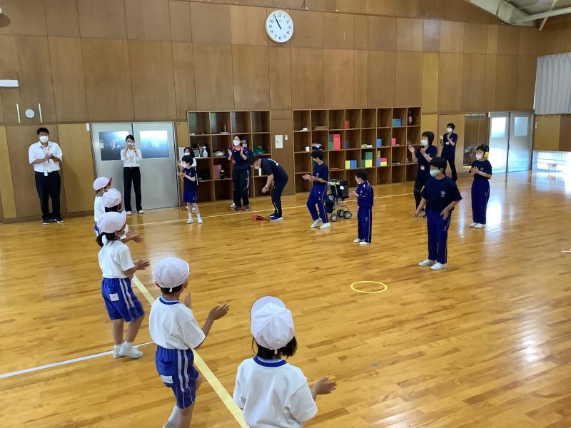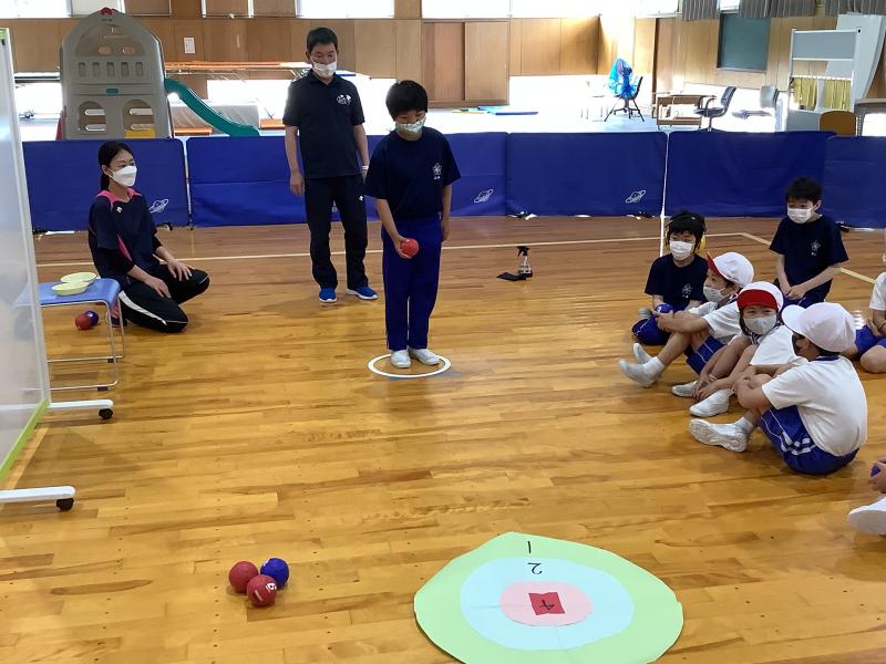 今回は,門前東小学校の1・2年生が分校に来てくれました。お互いに自己紹介をしたり,エビカニクスを一緒に踊ったりしました。また,ボッチャは門前東小学校の皆さんは初めてだったようですが,終わるころになると「もっとしたいな。」「もう終わり?まだしたいなあ。」などの声が上がっていました。