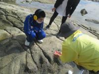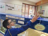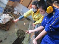 生徒たちは、立体映像のマリンシアターで能登の海の様子を鑑賞した後、展示水槽の九十九湾の生き物を見たり、タッチプールに手を入れ、サザエやヒトデ、なまことの触れあいを体験したりしました。磯の観察路では、磯にすむ魚を観察したり、スジエビやヤドカリを手にとったり、自然に生息する生き物に直接、触れることもできました。