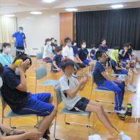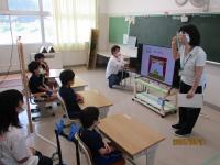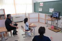 「輪島分校」の歌をみんなで聞いた後で、教頭先生からのお話、養護教諭の久田先生からのお話がありました。教頭先生から「夏休み、おうちのお手伝いをしましたか。」と聞かれ、元気に「はい」と手を挙げていました。久田先生からは、コロナウイルスについての注意喚起の動画(3密をさけよう)の紹介、マスクや手洗いについての説明がありました。最後にコロナウイルスについての偏見や差別の防止についてのお話もありました。