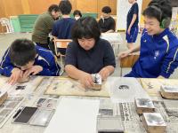 2025年10月22日 11時10分10月16日(木)に、東京国立博物館の方より、「ひと、能登、アート。」訪問授業を行っていただきました。石川県出身の画家・長谷川等伯が描いた作品〈国宝〉松林図屏風の複製を使用し、作品や描かれているものなどについて見て、感じて、楽しむことができました。また、屏風型のワークシートに松の木のスタンプを押して、オリジナル松林図屛風作りも体験しました。