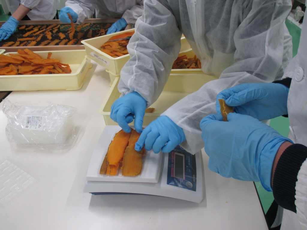 お客さんに手に取ってもらえるように、ていねいに筋の部分を取り除いたり干し芋の並べ方に注意したり、分量の計測をきっちりしたりと、商品化する過程をたくさん学ぶことができました。