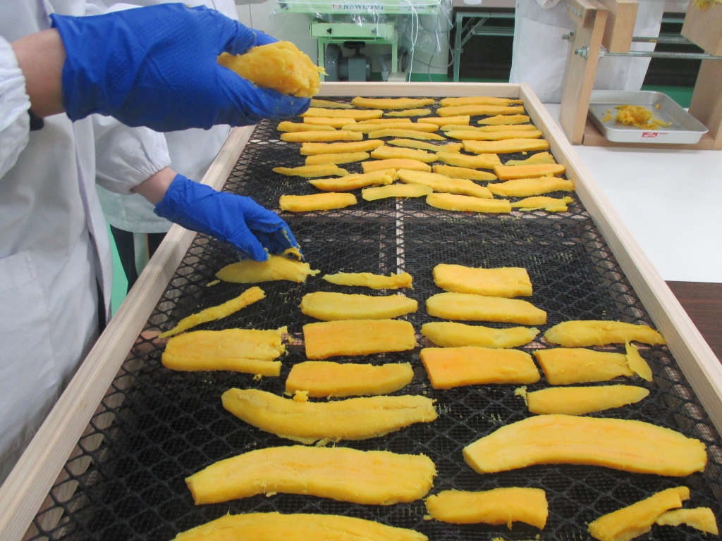 蒸した芋を並べて干す作業から、選別、袋詰め、ラベル張りと一連の作業を体験してきました。