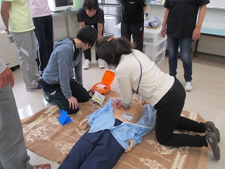 5月30日(水)創立記念日で児童生徒は休日だったのですが、学校ランチルームにおいて救急法の講習会を行いました。講師に門前分署の消防士さんに来ていただき、心肺蘇生法やAEDの使用方法、アナフィラキシー対応のエピペン処方などについて、演習を行いました。毎年行っている講習会ですが、緊急時には適切な対応ができるように、気を引き締めて取り組みました。また、突発的な事故が起きないように日頃から健康観察・安全管理を意識していかなければなりません。