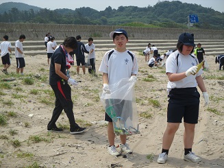 門前高校1,3年生と一緒に、高等部のみんなで、道下サンセットパーク裏の海岸で、ゴミ拾いをしました。蒸し暑いお天気でしたが、軍手にゴミばさみ、ゴミ袋で頑張りました。