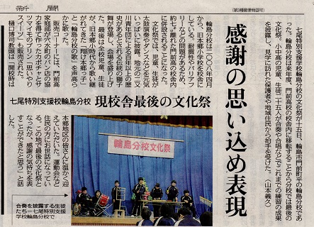 10月15日(土)輪島分校文化祭が開かれ、大勢の人にご来校いただきました。オープニングは体育放送委員会の生徒によるオリンピックをモチーフにした演出でスタートしました。また、今年度は現校舎で最後ということもあり地元の二又川青年団から獅子舞を披露していただきました。