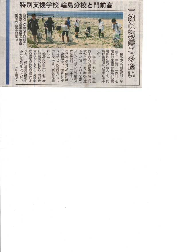 6月24日(水)輪島分校高等部1・2年生徒(3年生は職場実習のため参加できず)が門前高校3年生と一緒に、門前町の「間の浜」で海岸のゴミ拾いをしました。最初は、2つの学校が別々に海岸のゴミを拾っている様子でしたが、徐々に門前高校の生徒が、「○○さんだよね?同じ小学校だったけど覚えている?」など、たくさん声をかけてくれました。輪島分校の生徒を知ろうと意識している生徒も見られ、2017年度の移転に向けて、良い機会となりました。