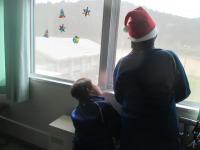ダンス『ジングルベル』やパズルゲーム、椅子取りゲームをして楽しみました。最後はみんなで作ったツリーの点灯式。リンリンリン…何の音かな?窓の外を眺める子どもたち。振り返ると、大きなプレゼント袋を持ったサンタさん!!