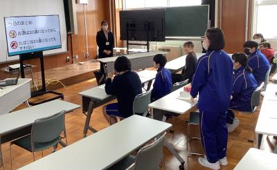 能登北部保健福祉センターから講師をお招きし、お酒とたばこが体に与える危険性や勧められた時の断り方について学びました。ロールプレイングでは、「少しだけお酒のんでみない?」「一緒にたばこ吸ってみない?」という誘いに対し、「まだ20歳じゃないので飲みません。」「健康に悪いので吸いません。」と自分の言葉で断ることができました。