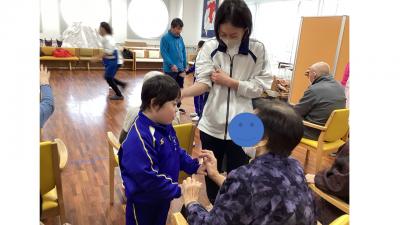 「ドンスカパンパン応援団」や「世界はパラダイス」のダンスを披露したり、利用者の方と一緒に「幸せなら手をたたこう」の手遊び歌をしたりしました。「幸せなら手をたたこう」では、音楽に合わせて利用者の方と手をタッチしたり、手をつないだりして触れ合いました。利用者の方からは、「楽しかったです。ありがとう。」と言っていただきました。
