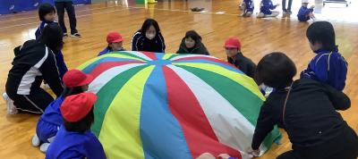 輪島分校は、門前東・西小学校のみなさんとバルーンを使った表現遊びをしました。小学校のみなさんと一緒に活動したことで、人と人の間隔が狭まりバルーンが大きく膨らみ、きれいなおやまができました。