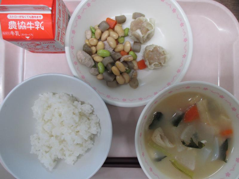 9日(火)ごはん ポークシュウマイ 五目煮豆 けんちん汁 牛乳