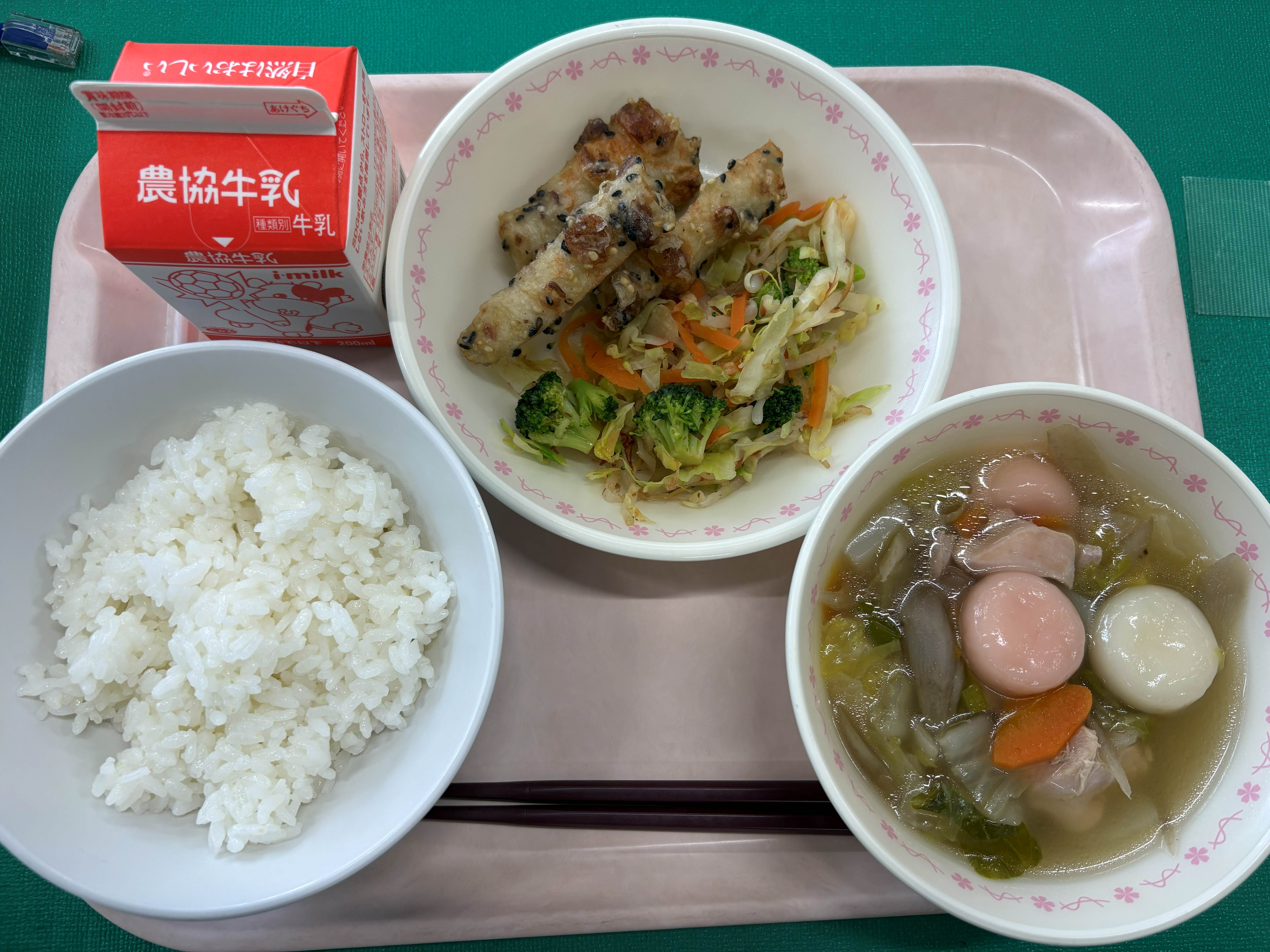 1月9日(金) 鏡開き給食 ごはん ちくわの石垣揚げ おかか和え 五目雑煮 牛乳