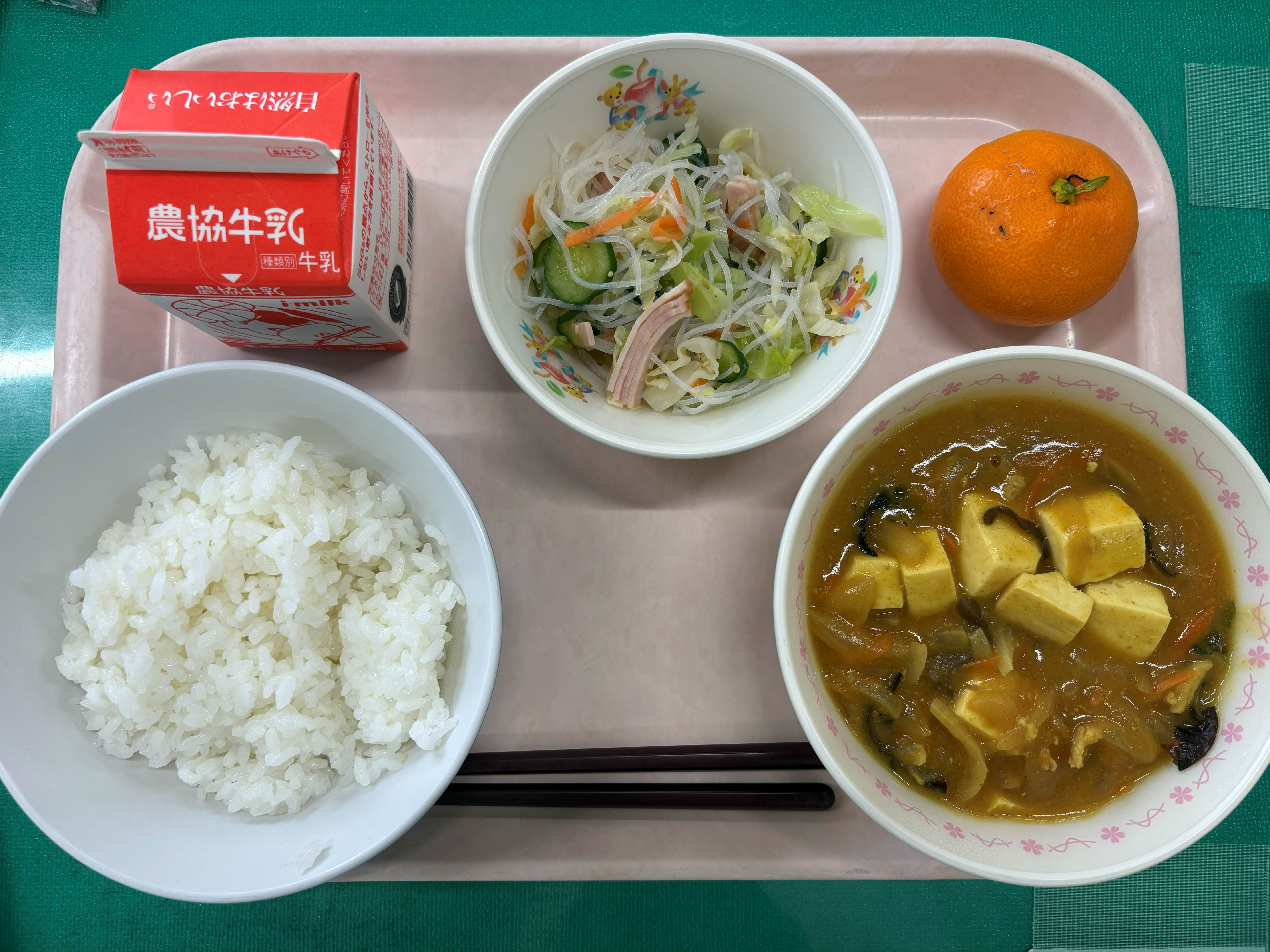 1月13日(火) ごはん 豆腐のカレー煮 中華和え みかん 牛乳