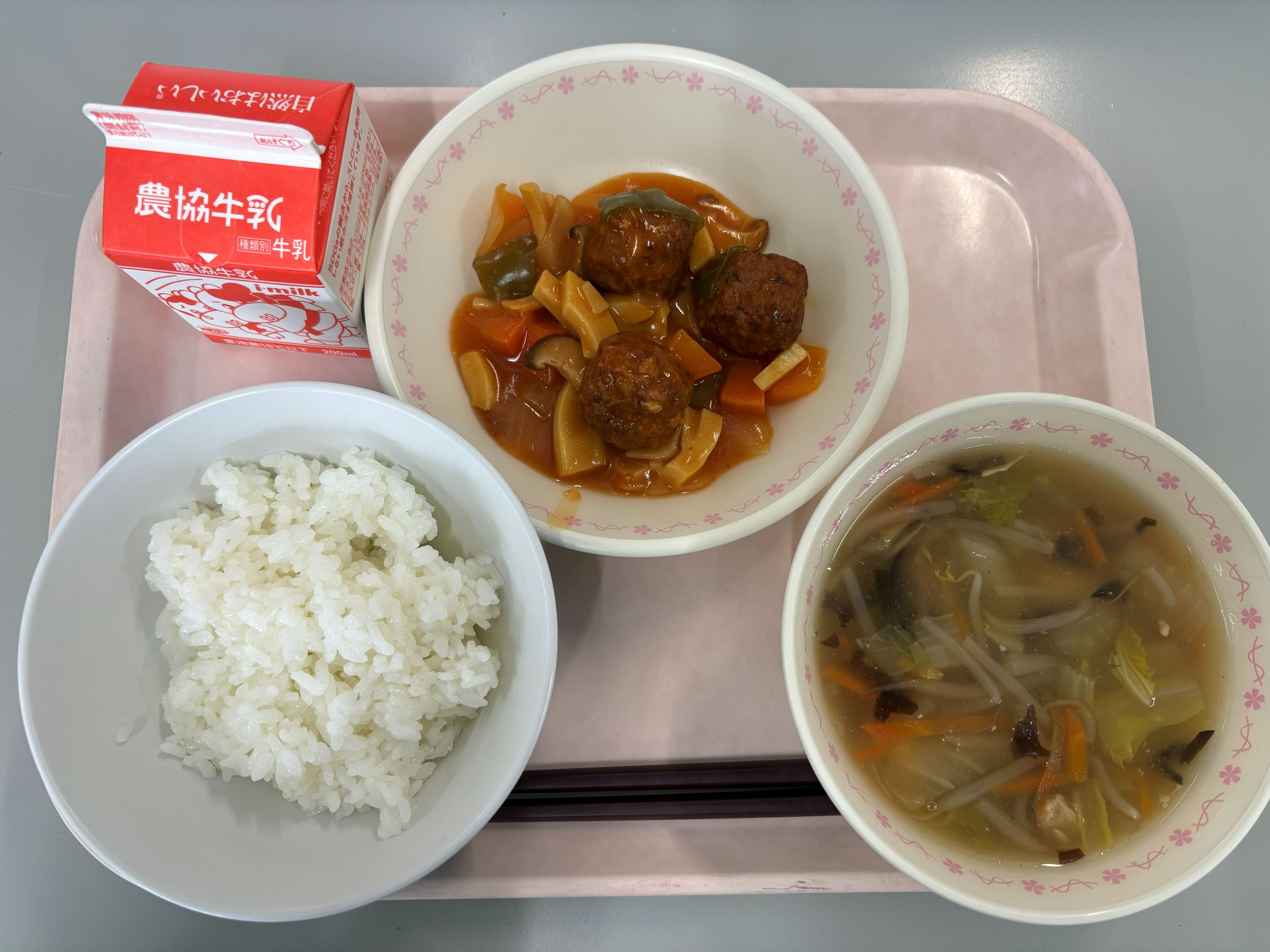 1月20日(火) ごはん 肉団子と野菜の中華炒め 豆腐のあんかけスープ 牛乳