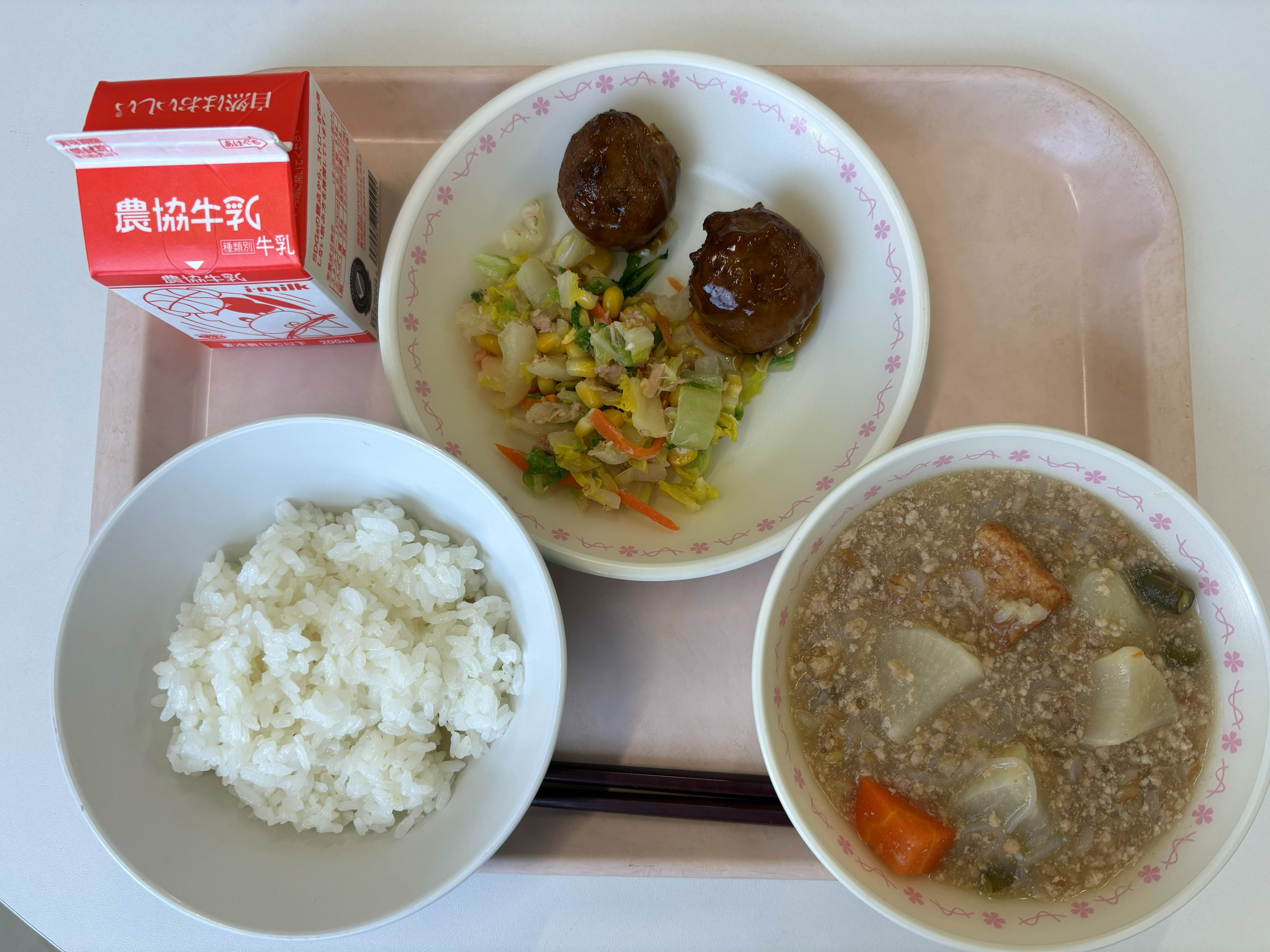 1月22日(木) ごはん 肉団子 白菜のツナコーンサラダ 大根のそぼろ煮 牛乳