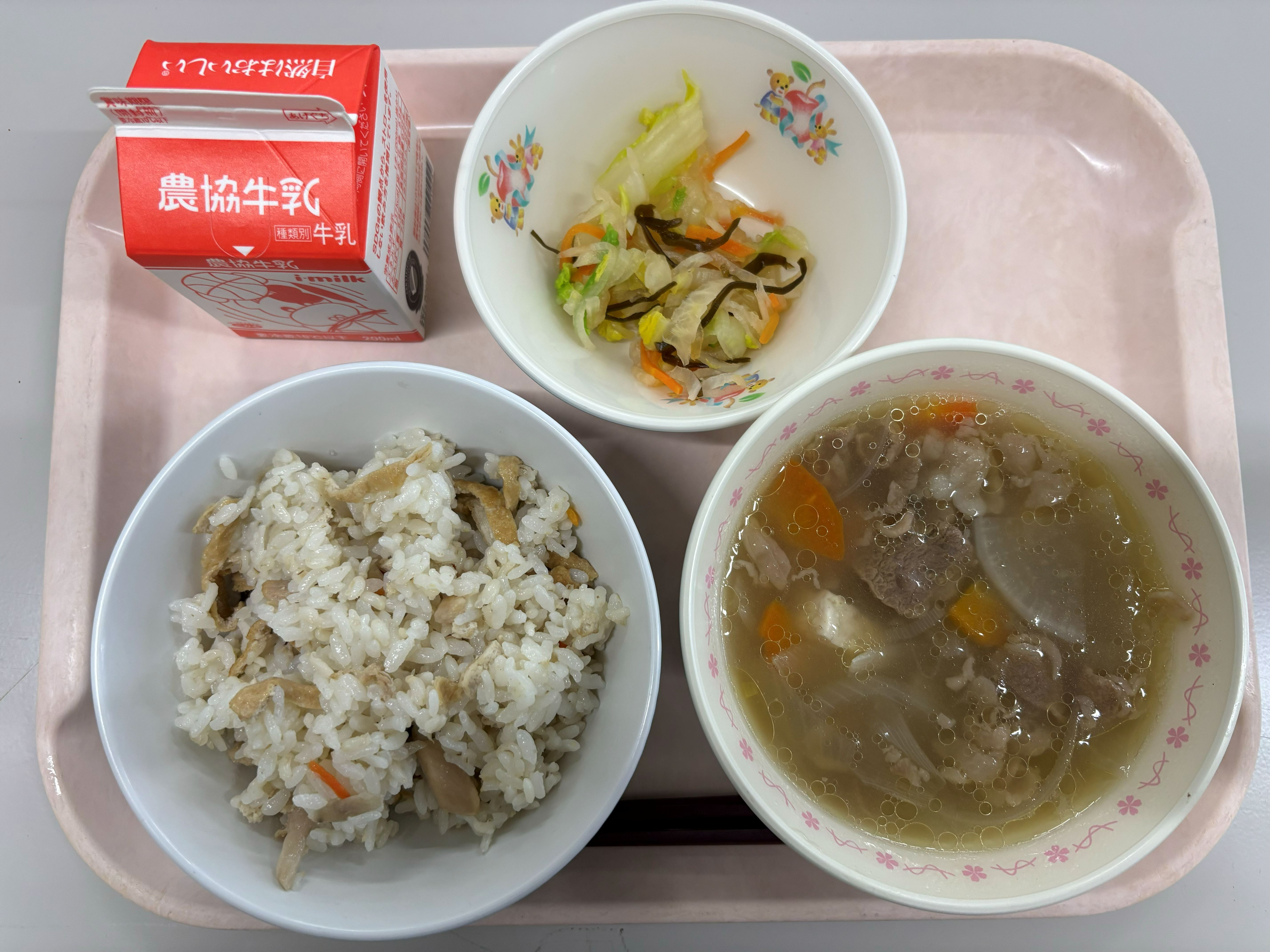 1月26日(月) 大阪給食 まぜまぜかやくごはん 野菜塩昆布和え 肉吸い 牛乳
