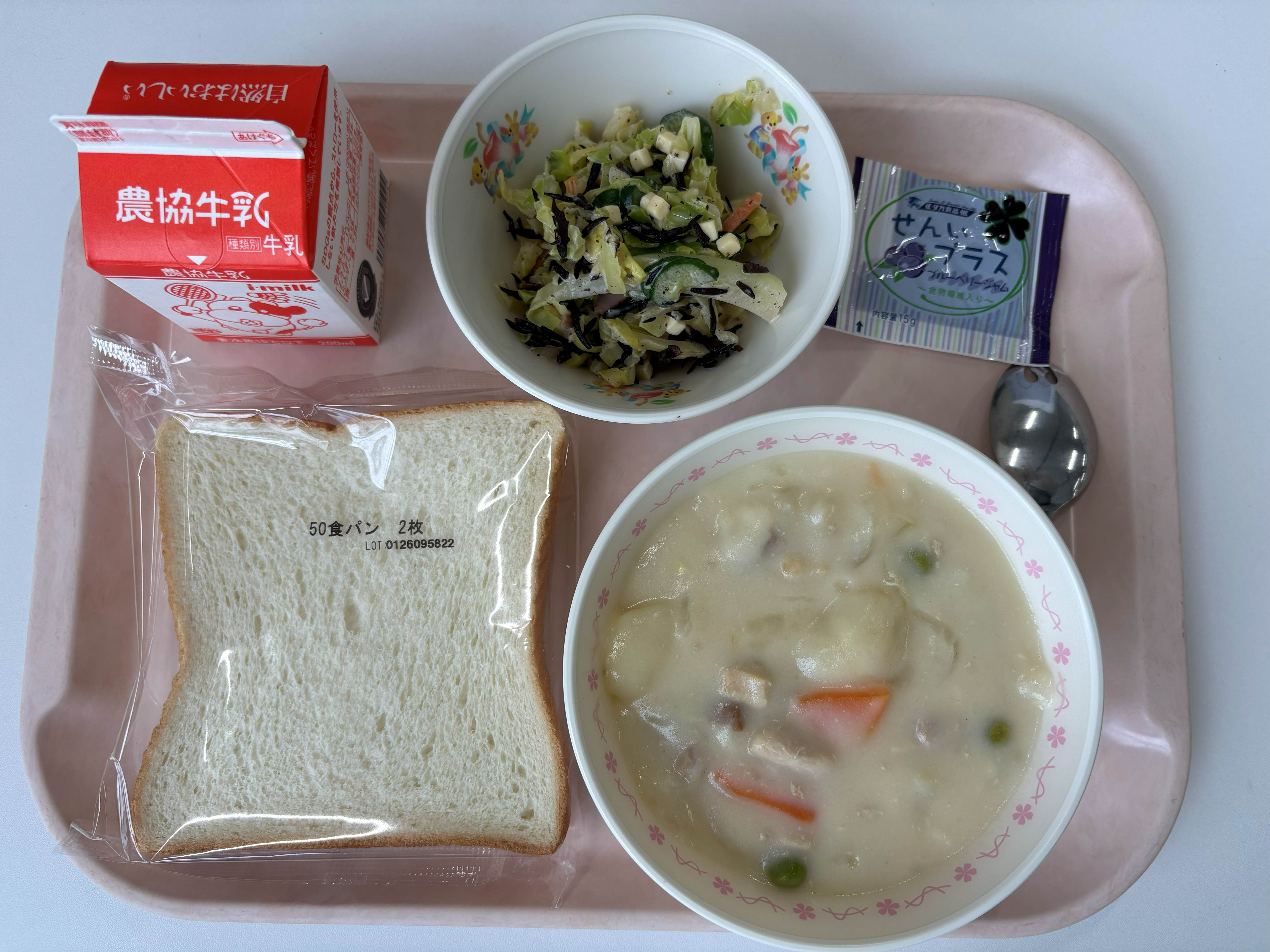 1月28日(水) 食パン クリームシチュー ひじきサラダ ブルーベリージャム 牛乳