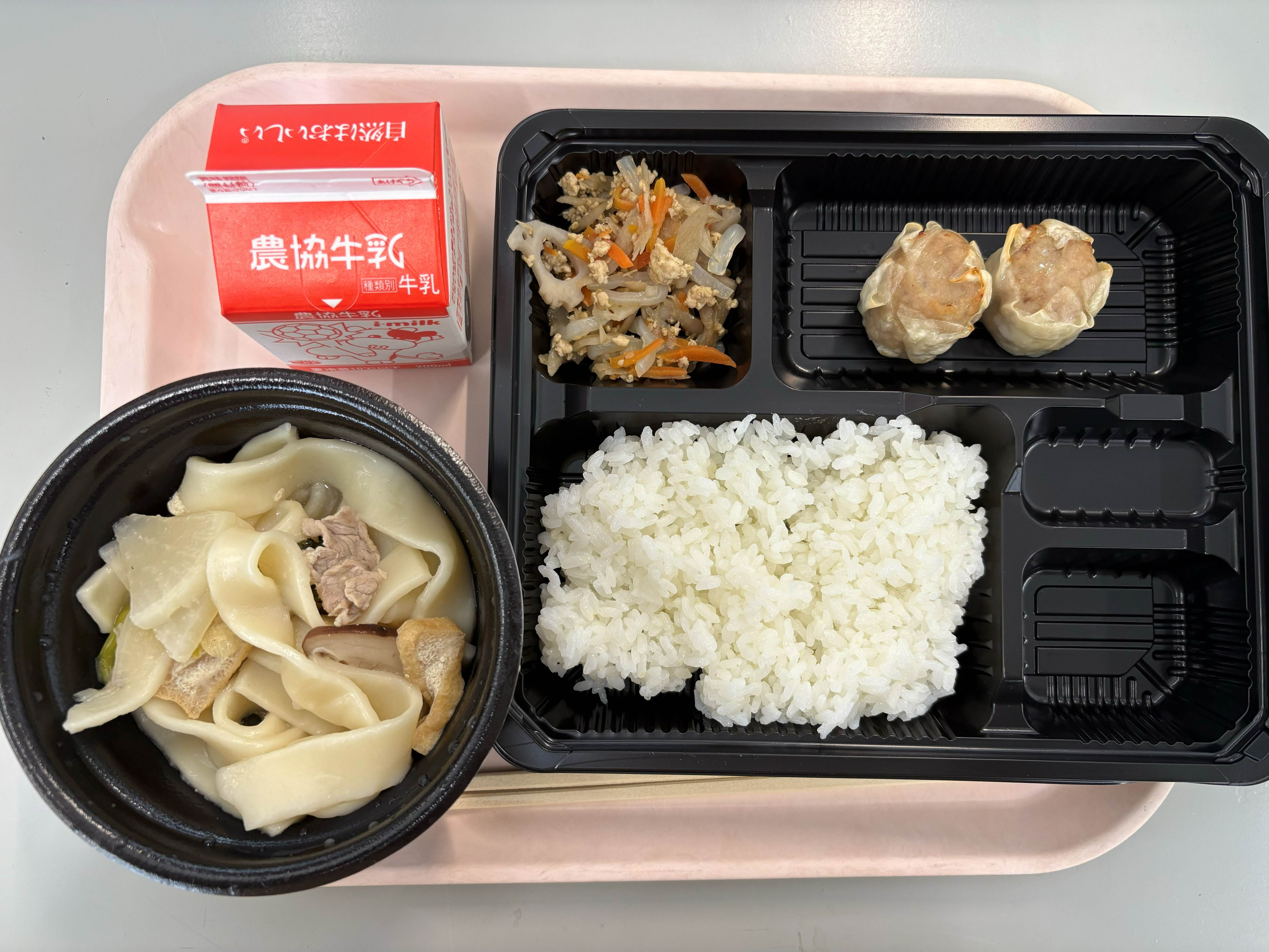 1月29日(木) 群馬県給食 少なめごはん シュウマイ こんにゃくのきんぴら おきりこみ 牛乳
