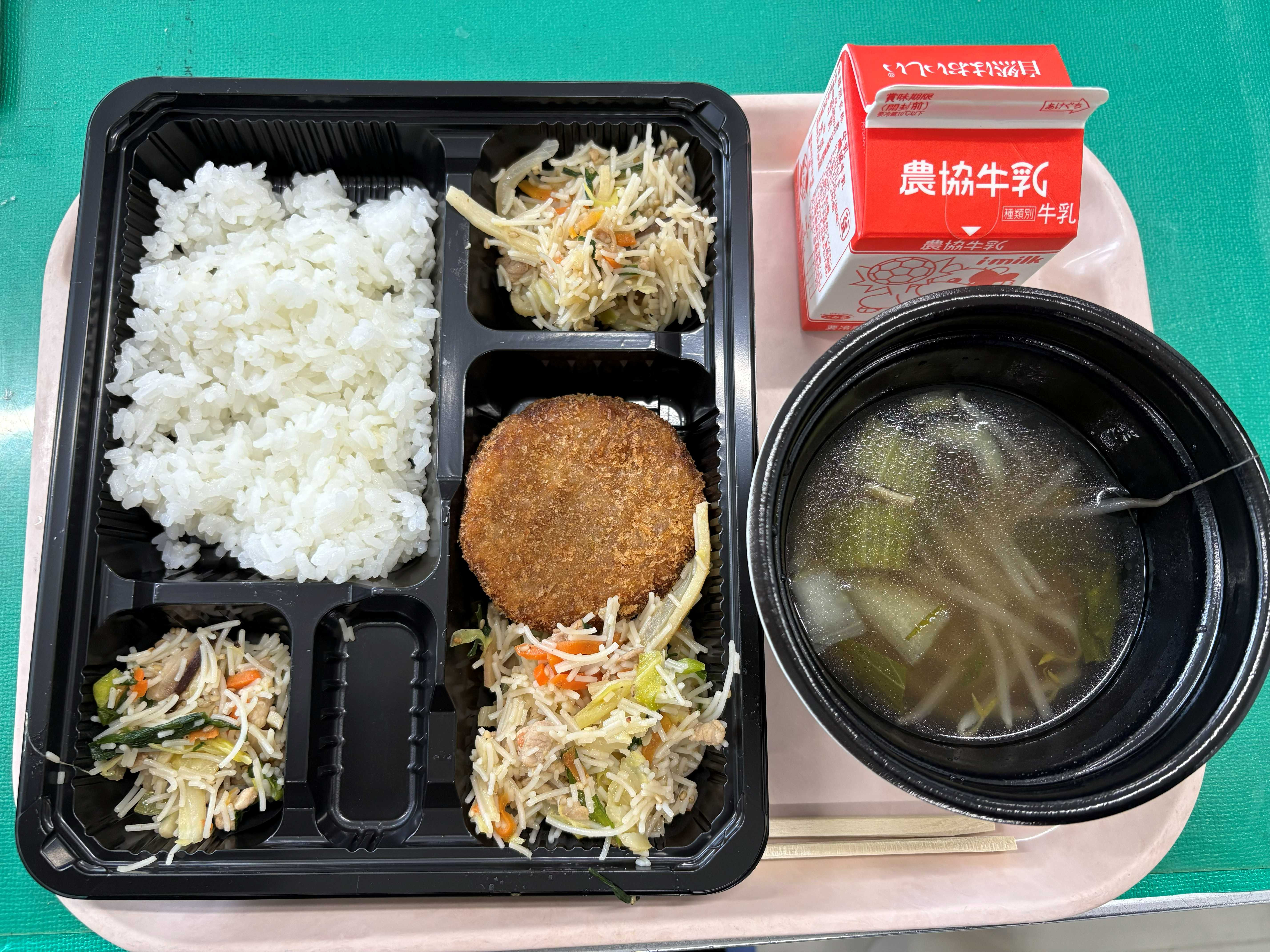 2月2日(月) ごはん メンチカツ 五目ビーフン もやしのスープ 牛乳