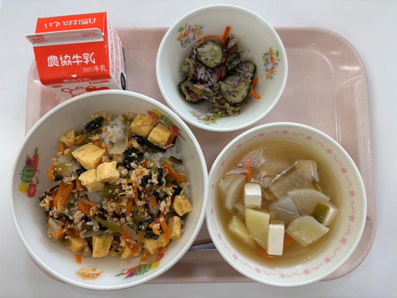 7月4日(金) そぼろどん 具だくさん汁 ゆかり和え 牛乳