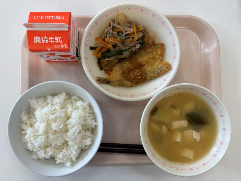 7月8日(火) ごはん めぎすのフライ しらたきのチャプチェ みそ汁 牛乳