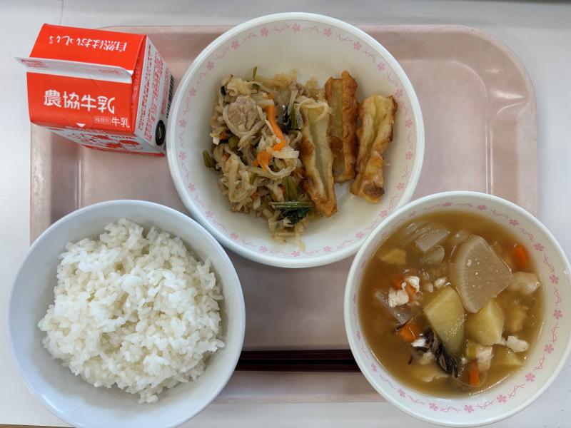 7月10日(木) ごはん ちくわのチーズ揚げ きりぼしだいこんのピリ辛炒め みそけんちん汁 牛乳