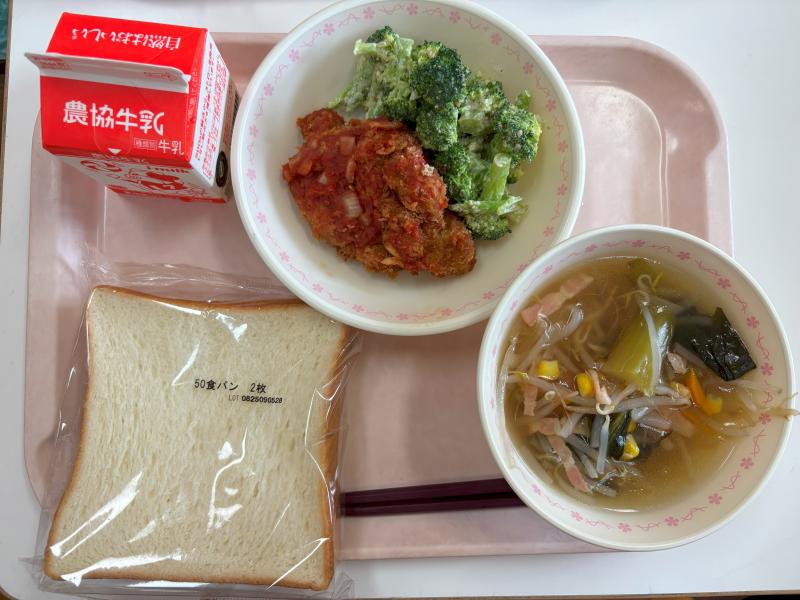 9月3日(水) 食パン チキンカツトマトソース ブロッコリーのごまマヨ和え コンソメスープ 牛乳