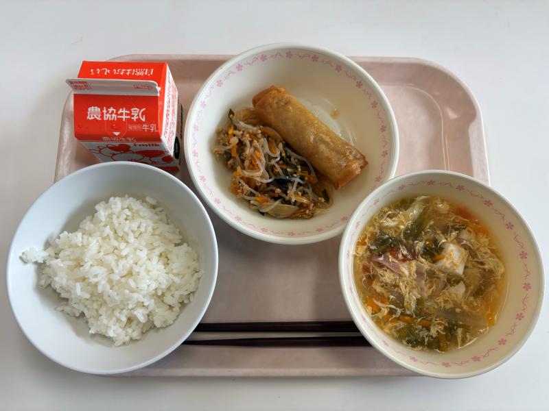 9月9日(火) ごはん はるまき しらたきのチャプチェ トマトとたまごのスープ 牛乳