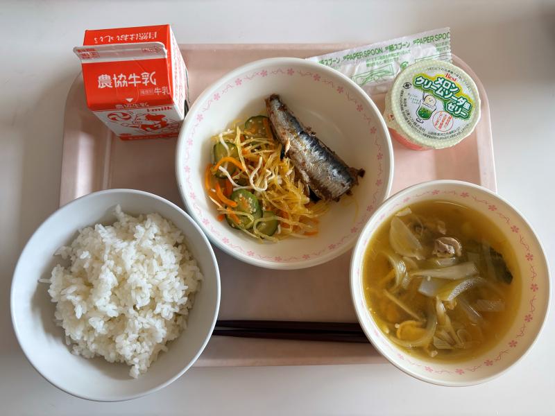 9月16日(火) ごはん いわしの梅煮 そうめんかぼちゃのごま和え 夏豚汁 メロンクリームソーダ風ゼリー 牛乳