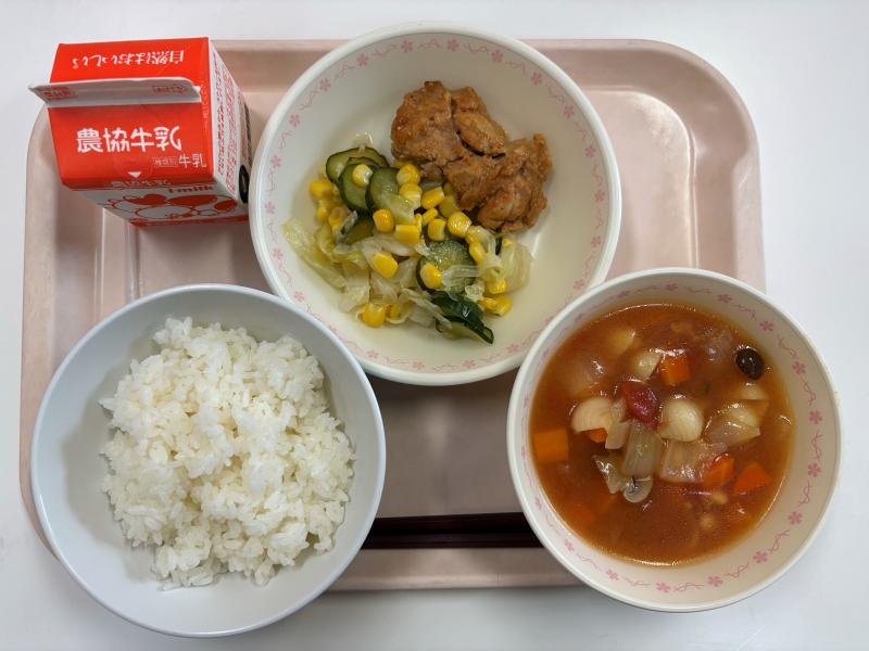 9月18日(木) ごはん タンドリーチキン コーンサラダ ポークビーンズ 牛乳