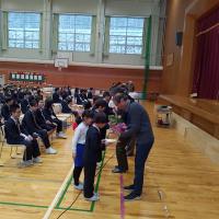 はじめに、見守り活動や授業での支援、校内の環境整備等、本校の教育活動にご支援ご協力いただいている地域の皆様に、全校児童各学年の代表が感謝の気持ちを伝えました。