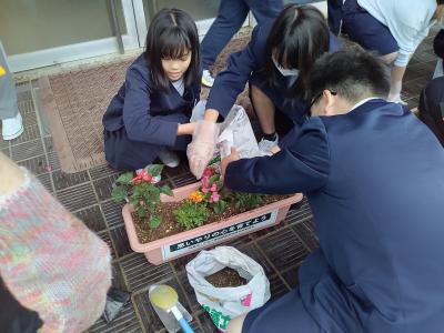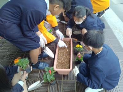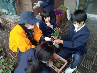 5月13日(月)小松人権擁護協議会能美部会の皆様より人権の花をいただきました。あいにくの雨でしたが、玄関前で贈呈式を行いました。人権擁護委員の皆様に教わりながら、6年生28名がいただいた花の苗(マリーゴールド、ベゴニア、サルビアなど)をプランターに植えました。玄関前がぱっと明るくなりました。花の栽培を通して思いやりの心や命を大切にしていきたいですね。人権擁護委員の皆様、ありがとうございました。