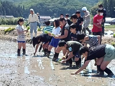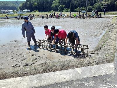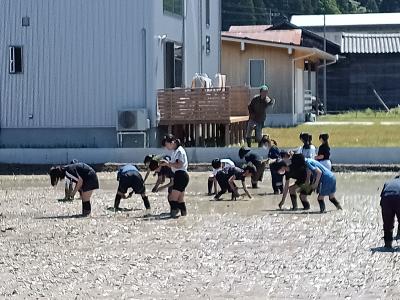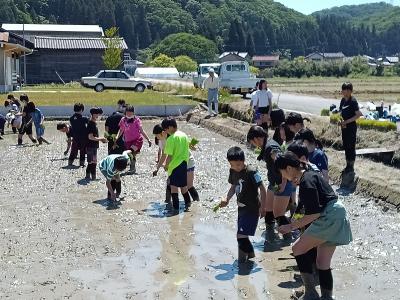5月14日(火)気持ちのよい青空の下、5・6年生が田植え体験を行いました。地域の皆様に教わりながら、苗を一つ一つ自分たちの手で植えていきました。これから成長していく様子が楽しみですね。たいへん貴重な体験に、みんなの笑顔がたくさん咲きました。