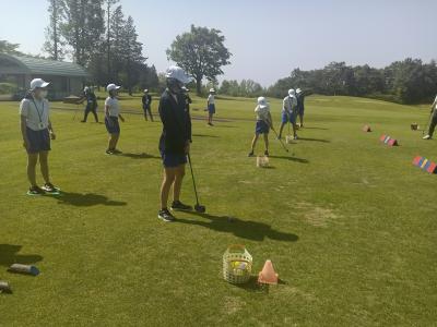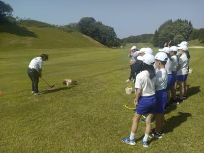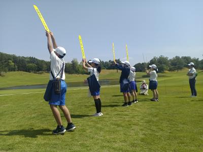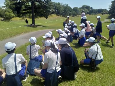 本校より程近いゴルフクラブ ツインフィールズで現在「JLPGAステップ・アップ・ツアー ツインフィールズレディーストーナメント」が行われています。それに合わせて、今年度初めて6年生が職業体験とゴルフ体験をさせていただきました。広大なゴルフ場と立派な施設、プロゴルファーのショットを目の前で見ることができ、驚きの連続でした。18番ホールのグリーン前で「お静かに プレー中です」と書かれたボードを上げる職業体験を行ったり、スナッグゴルフを体験したりと、貴重な体験をすることができました。お世話になった皆様、ありがとうございました。