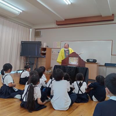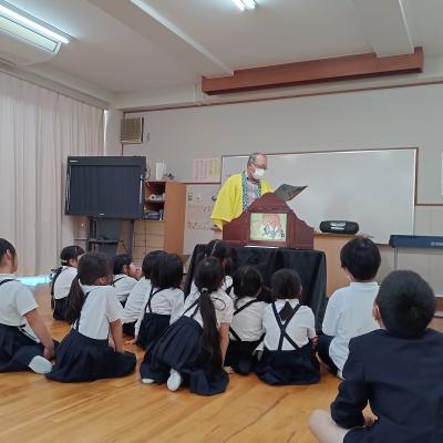 5月29日(水)の昼休み、本校図書ボランティア 森元道夫先生の「お昼のお話会」が行われました。今日は「あんもちみっつ」「じろうまるのおはなし」の2本立てでした。森元先生の魅力あふれるお話しぶりに、集まってきた子どもたちは身を乗り出して、お話の世界を楽しんでいました。今年度も「お昼のお話会」は毎月1回行う予定です。