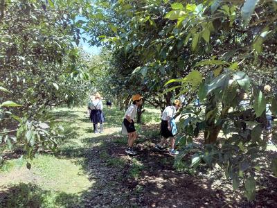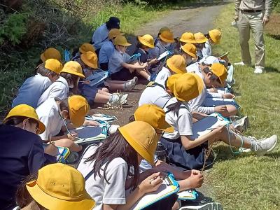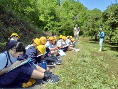 5年生は総合的な学習の時間に「国造ゆず」について学習しています。今日は「ゆず団地」を見学し、生産者の方にお話を伺いました。ゆずの木々を目の前にしながらお話を聞くに従い、次々と疑問が浮かんできたようです。質問をしてわかったことをメモに取りながら学習を深めることができました。
